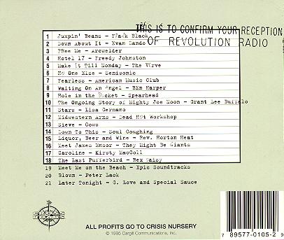 The CD sold in local Twin Cities stores for about $10. A benefit concert was held in the 1st Avenue main room. Tickets cost about $15 dollars, and ticket holders received a free copy of the CD. The CDs were handed out after the concert, in a parking lot directly across 7th street from the 1st Avenue club. In exchange for a concert ticket stub, Rev staff members were distributing the CDs out the back door (the emergency exit door) of the red-and-black REV bus. The album and concert brought great music to REV 105 listeners, but true to the spirit of community embraced by REV 105, all the profits from this album went to support the Minneapolis Crisis Nursery. The album is intentionally put together with an amateurish look. I think this reflects the independent spirit and low power transmitters of REV 105. The graphics feature simulated rubber-stamp text on the covers, and what looks like bad photo copies of typewritten text in the liner notes. There are even some handwritten corrections. I've attempted to capture this style by maintaining the accidental UpperCAse just as it appears on the album. The jewel-case booklet is 8 pages. It's one long strip with 4 pages printed on each side and then folded. Below, I've include the complete text printed in the booklet, and on the cover, and CD. This includes liner notes on the production staff, special thanks, and artist credits. I've also included 5 brief samples from the CD. |